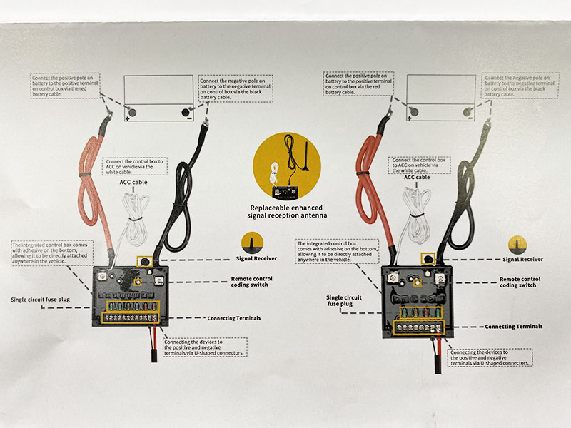 3. The signal reciver should not be placed near metal parts of the vehicle. please ensure there is some distance between them.